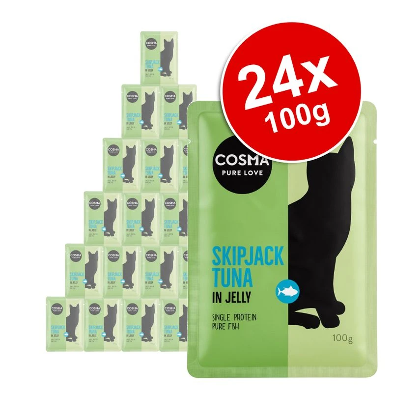 Cosma Original Pouches 24 x 100g Saver Pack is a supplementary high-quality wet food for adult cats. It is made from pure meat or fish in a delicious jelly and provides your cat with a species-appropriate food. Each variety contains only a single source of protein (meat or fish) and is made with top-quality ingredients which have been gently prepared to retain the delicious, natural taste. This species-appropriate food is free from artificial preservatives, taste enhancers and colours.